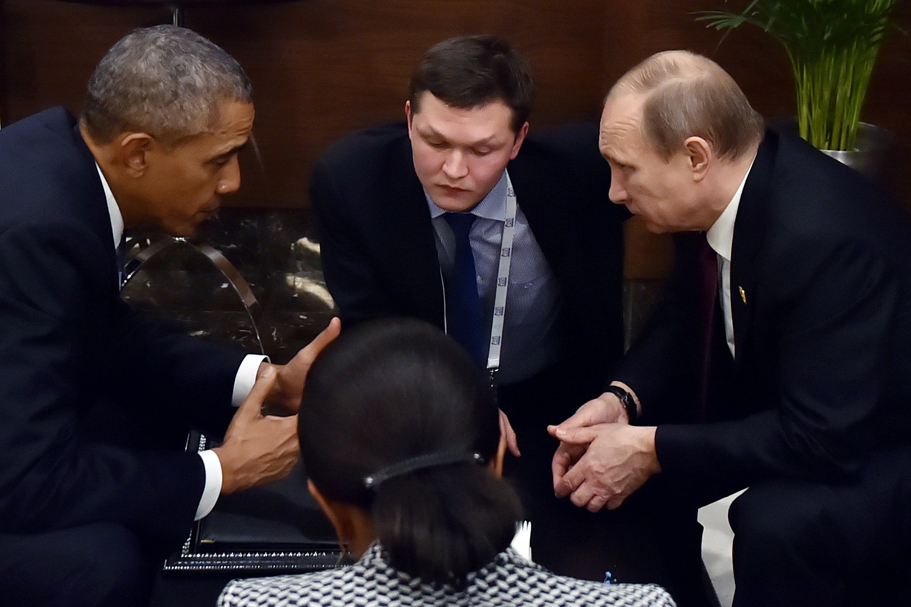 Путин и Обама провели беседу в перерыве между мероприятиями саммита "Большой двадцатки", сидя за журнальным столиком в большом холле, заполненном участниками форума. В беседе двух президентов участвовали советник президента США по национальной безопасности Сьюзан Райс и переводчик российской стороны.