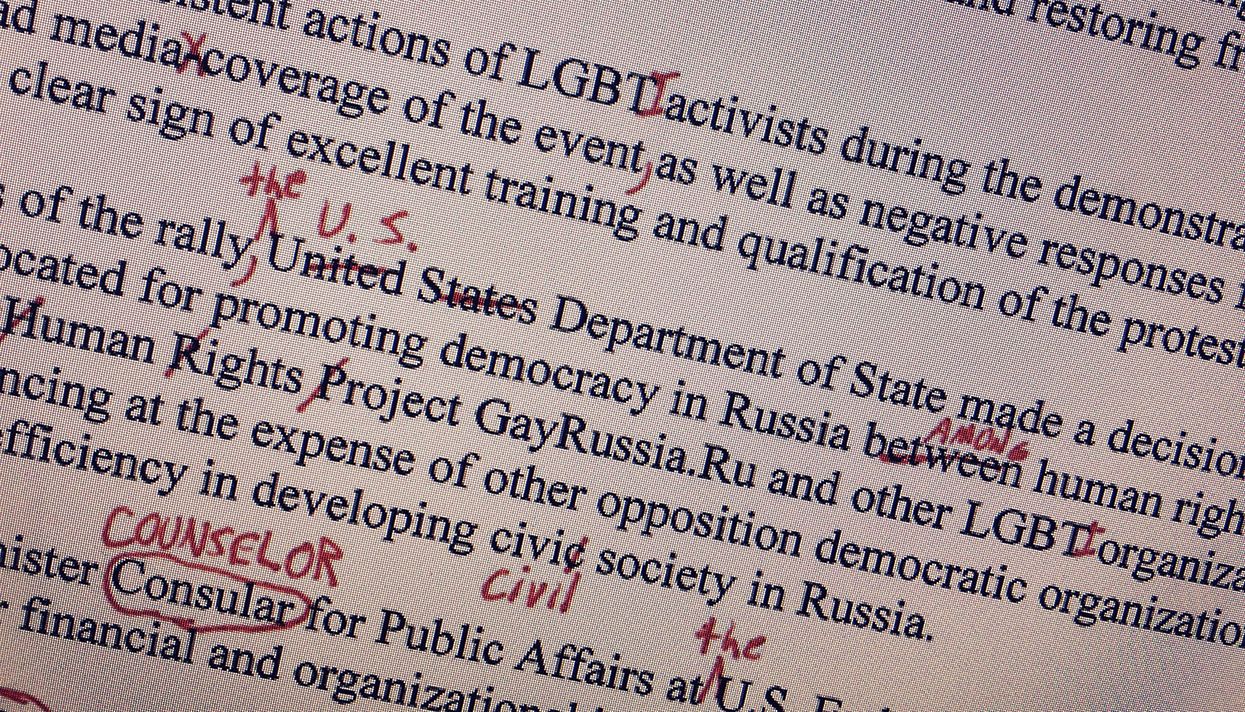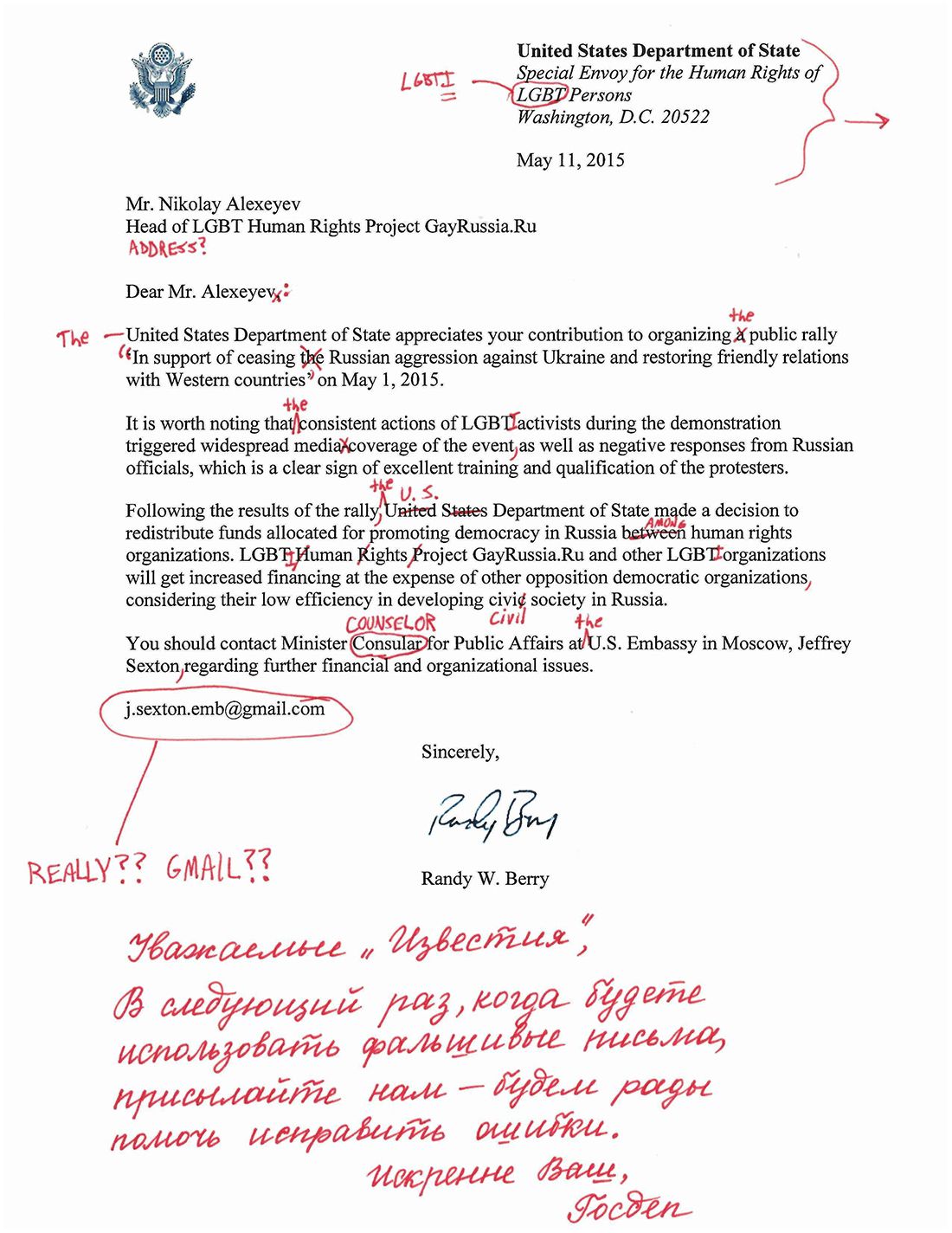 Посольство США изучило этот документ и нашло в нем 22 ошибки — от грамматики и неправильного наименования должности уполномоченного (LGBTI — последняя буква является аббревиатурой термина «интерсексуалы») до указания электронной почты в сервисе Gmail (обычно чиновники используют адреса в домене state.gov).