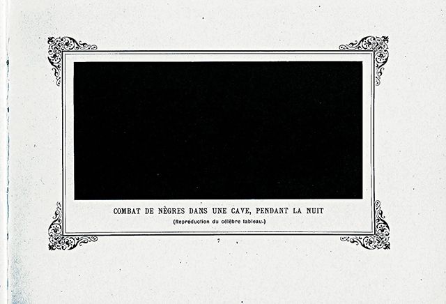 Загадочная надпись, собственно, ставшая сенсацией, — это отсылка к самой известной картине француза Альфонса Алле (1854–1905). Его работа, написанная в 1880-х годах, представляет собой полностью черный прямоугольник (почти квадрат), чья чернота мотивирована названием: «Битва негров в пещере глубокой ночью». Вскоре после «негров» он написал абсолютно белую картину «Малокровные девицы, идущие к первому причастию в снежной буре», а потом — «Апоплексических кардиналов, собирающих помидоры на берегу Красного моря», понятно какого цвета. Монохромные эксперименты Алле не ограничивались тремя цветами, но именно эти картины предсказали три главных квадрата Малевича — черный, красный и белый, — которые художник соотносил со стадиями развития супрематизма.