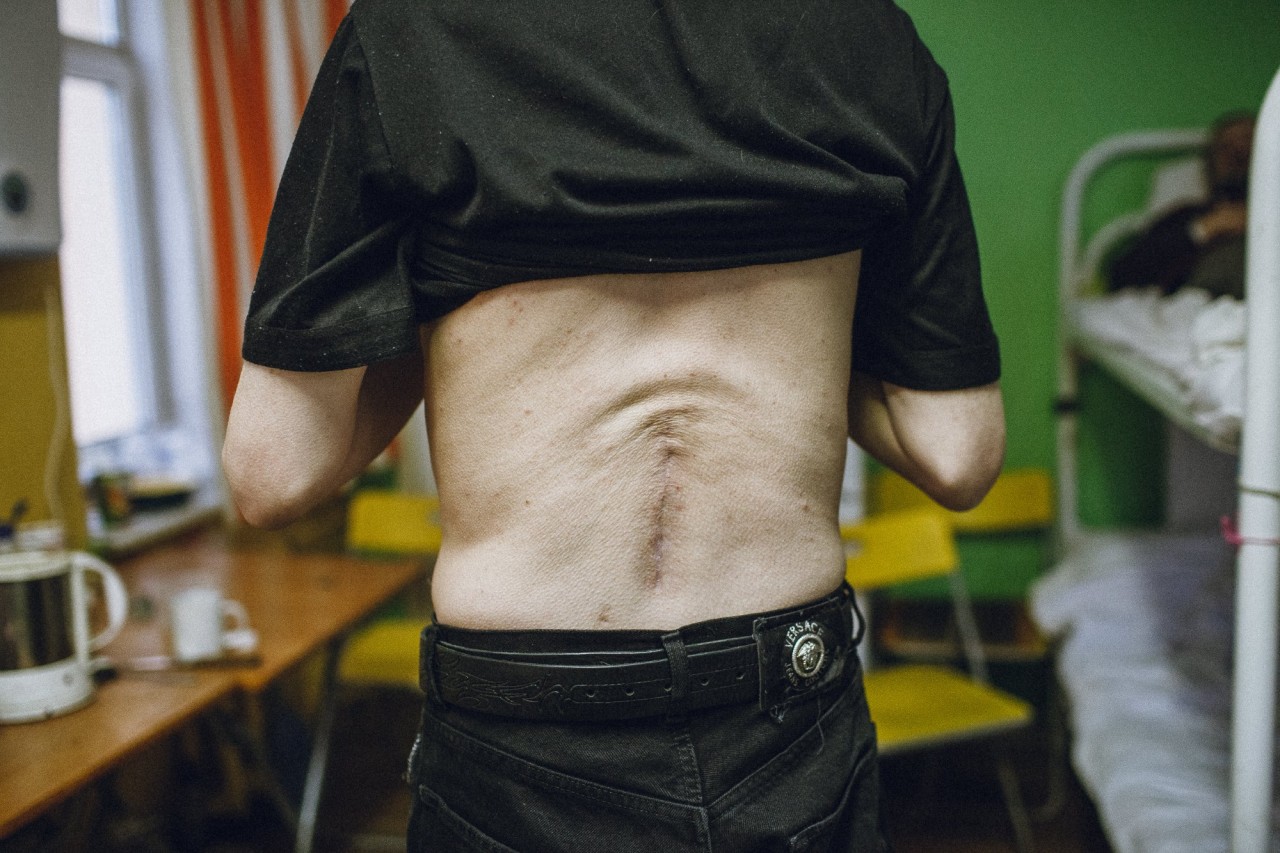 Алексей показывает след от операции на позвоночнике после перелома. Травму он получил в Мурманске, куда отправился в командировку, неофициально устроившись сварщиком. Восстанавливали штаб в военном городке. Алексей сорвался с третьего этажа. В результате сломал позвоночник, обе руки и ноги. Так как был устроен неофициально, денег ему не заплатили.Фото: Валерий Зайцев для ТД У меня три сломанных позвонка, врачи сказали — повезло, сказали — был бы перелом на один позвонок ниже, стал бы я инвалидом, ноги бы отказали полностью.