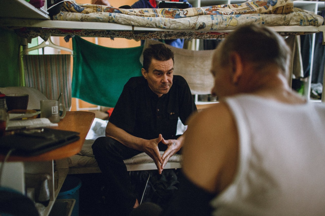Алексей общается со своими соседями. В ночлежке он с июля 2015 года.Фото: Валерий Зайцев для ТД Сложно то, что на серьезную работу без регистрации не устроиться. Я когда работал на Кировском заводе сварщиком, познакомился там со своим напарником, тоже сварщиком. Он через некоторое время говорит: «Леха, мы с тобой увольняемся. Есть два места на Адмиралтейских верфях — это в порту. Зарплата от 100 тысяч и выше». Ему-то хорошо — у него прописка петербургская, а туда без прописки или со временной не берут людей. Он устроился и мне две с половиной недели держал место сварщика, чтоб мне туда тоже устроиться. Я пробовал, но, к сожалению, служба безопасности меня не пропустила. Я у знакомой хотел прописаться, но оказалось, что нельзя, — у нее там долги по квартплате, еще двое человек прописаны, поэтому мне дали отбой, и место хорошее я потерял. Пришлось устраиваться в такие конторы, где зарплаты тысяч 20-25…