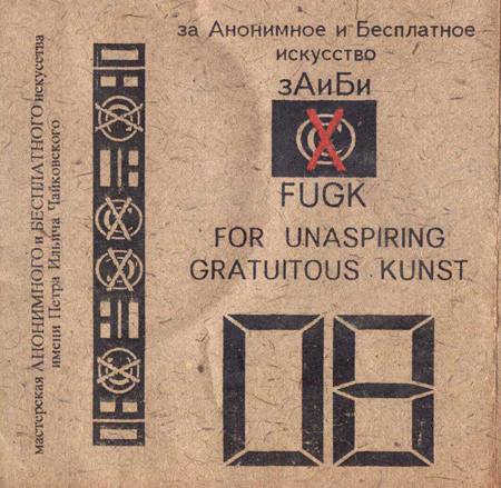 Алексей Цветков: Поповский, создавший «зАиБи», был легендой старшего поколения. Про него писали еще в гурьевском журнале «КонтрКультУР'а», который мы читали старшеклассниками в самом конце восьмидесятых. А теперь, в середине девяностых, к нему присоединилось новое поколение последователей из среды анархо-краеведов (Модель, Потапова). Когда ты приходил в гости к Поповскому, он, чтобы сразу создать правильное настроение, ставил под иглу советскую пластинку с песней «Колокола Бухенвальда», которую и сам любил исполнять. «Мастерские!» — гордо говорил он, когда у заибистов что-то получалось. Мастерские должны были в идеале покрыть всю землю, а пока создавали анонимное и бесплатное искусство, главным в котором был «первоначальный творческий импульс». То есть в теории заибистов творчество оказывало главное педагогическое воздействие все же на самого творца, а не на зрителя. Зрителю это творчество предлагало примкнуть и участвовать, подвергнуть себя аналогичной трансформации. В 1995-м началась чеченская война, и все левые ультрас решили делать антивоенный фестиваль в кинотеатре «Улан-Батор». Поповский выступал там со своими юными последователями, бившими в огромный бубен с заибистским антикопирайтным знаком и певшими хором песню «Мы — молодые безбожники!» Марина Потапова придумала от имени «зАиБи» несколько открыток: «Обувь! Одежда! Любовь!» или «<Хреновое> революционно, а остальное буржуи купят!» с комсомольскими значками на строгом фоне. Эти открытки были остроумными сувенирами, чтобы подарить приятелю или девушке, но для заибистов эти лозунги были тогда настоящим образом жизни.