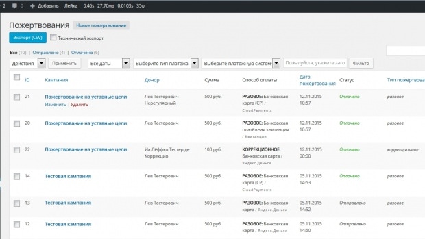 13. Таблица списка пожертвований на странице редактирования кампании снова удобно сортируется.