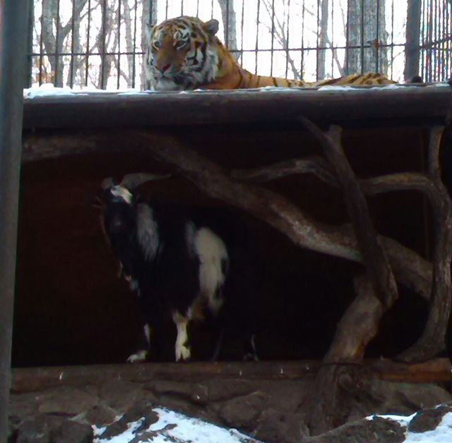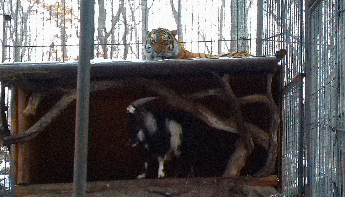 Козел по кличке Тимур не испугался тигра, потому что не знал, что его нужно бояться. Он принял хищника за вожака стаи и стал везде следовать за ним. Днем Тимур и Амур вместе гуляют по большому вольеру.