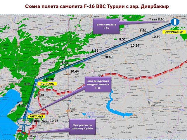 «Результаты объективного контроля РЛС Сирии подтверждают нахождение в воздухе двух F-16С в зоне дежурства с 9 часов 11 минут до 10 часов 26 минут в течение 1 часа 15 минут на высоте 2,4 тысячи метров, что говорит о заранее спланированной акции и готовности истребителей действовать из засады в воздухе над территорией Турции», — сказал Бондарев.