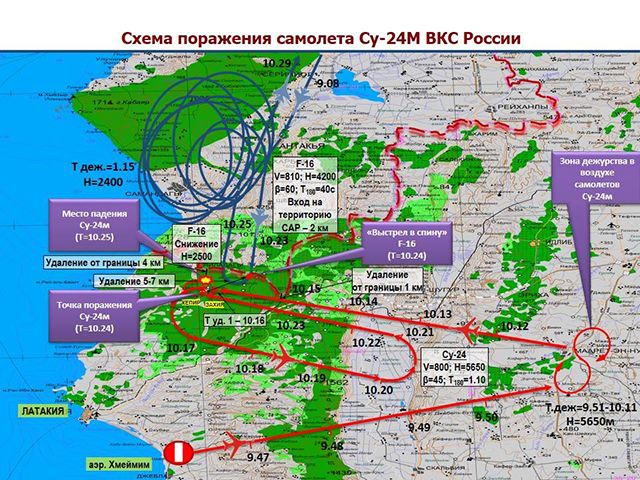 Главнокомандующий Воздушно-космическими силами РФ Виктор Бондарев заявил, что атака турецких истребителей на российский Су-24 была заранее спланирована, при этом истребители действовали «из засады в воздухе над территорией Турции». По словам Бондарева, истребителям не хватило бы времени для перехвата бомбардировщика, если бы они находились не в воздухе, а на турецкой базе в Диярбакыре.