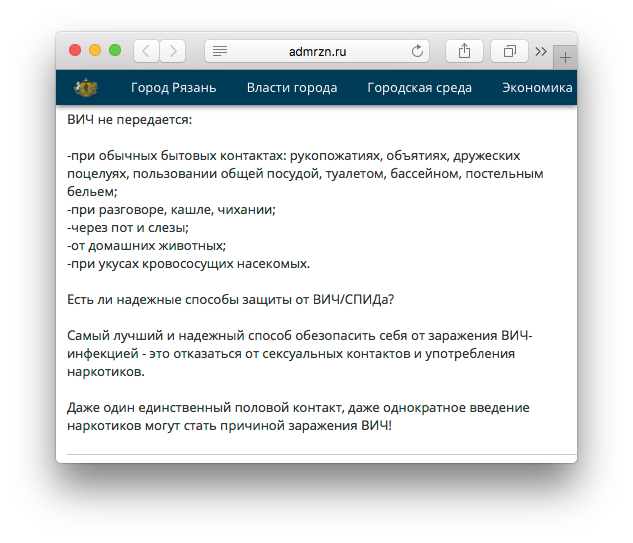 Финальная часть текста посвящена путям передачи ВИЧ и способам защиты от них. Правда, в плане защиты администрация города предлагает только две радикальные меры — отказаться от сексуальных контактов и употребления наркотиков.