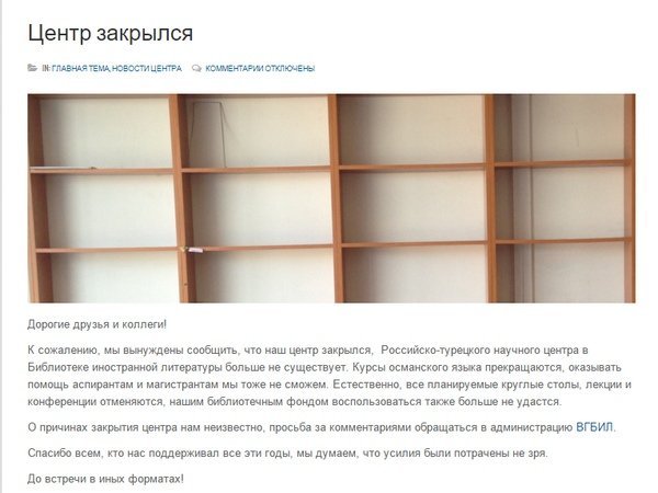 Руководство Всероссийской библиотеки иностранной литературы (ВГБИЛ) решило закрыть русско-турецкий научный центр по политическим причинам и из-за нежелания тратить на него деньги. Об этом говорится в заявлении ВГБИЛ.