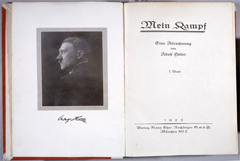 Книгу «Майн кампф» («Моя борьба») Гитлер написал в 1920-е годы, помимо автобиографических сведений в ней изложены идеи национал-социализма, в частности, рассуждения о «еврейской угрозе». В Третьем рейхе «Майн кампф» выпускалась огромными тиражами, книгу бесплатно выдавали членам нацистской партии и дарили молодоженам вместо Библии.