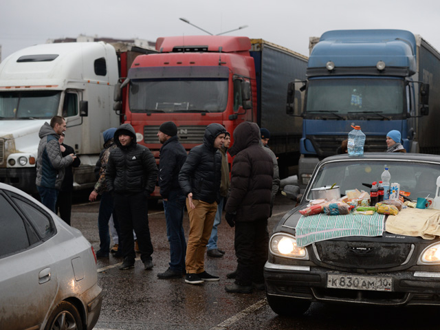 Дальнобойщики, собравшиеся на подступах к Москве в Химках, на сходе в воскресенье пытаются определиться со стратегией дальнейших действий. Об этом сообщает "Эхо Москвы" со ссылкой на Анастасию Никитенко, которую называет пресс-секретарем дальнобойщиков. В своем Twitter она сообщает, что водителям привезли вкусный борщ.
