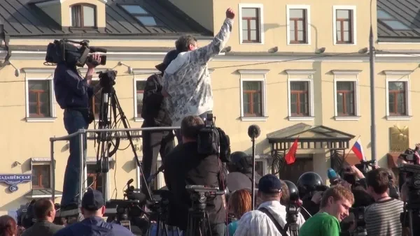 Лидеры оппозиции на Болотной. Буквально светятся детской радостью: столько людей пришло! Немцов что-то кричит толпе с тумбы, его стаскивают полицейские, в автозаке у них с Навальным забирают телефоны.