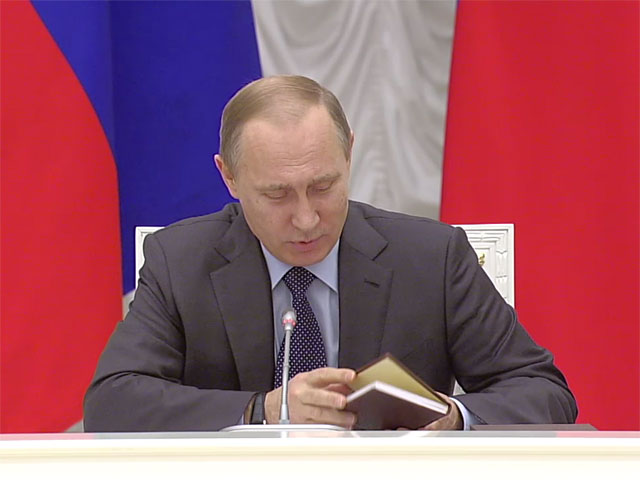 "У Виталия Леонтьевича Мутко сегодня день рождения, хочу поздравить его с этим событием. Поскольку Виталий Леонтьевич у нас занимается не только нашей деятельностью, не только наш футбол возглавляет, но и по международной линии активно функционирует, хочу подарить ему самоучитель английского языка", - сказал Путин. Он вручил книгу главе Минспорта и пожелал успехов в изучении английского языка.