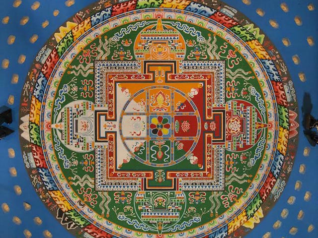 Слово "мандала" в переводе с санскрита означает "круг", "единство". Это графическое изображение дворца того или иного божества тантрического учения, передающее его суть на языке символов. Ее можно "читать" как текст и запоминать для последующего воспроизведения в медитации. Как правило, мандалы создают в двумерной форме из мелкого песка, окрашенного в традиционные цвета.