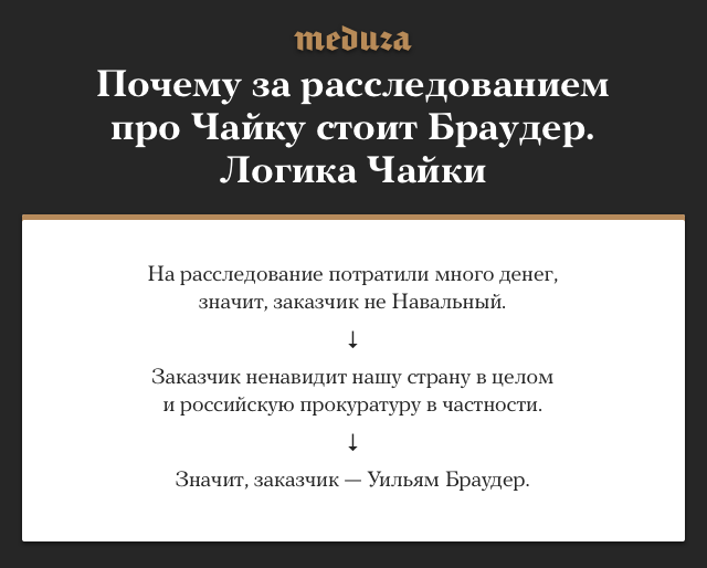 14 декабря «Коммерсант» опубликовал пространный ответ генпрокурора Юрия Чайки на расследование Фонда борьбы с коррупцией. Чайка в своем письме приходит к выводу, что за созданием фильма про бизнес его сыновей стоит не Алексей Навальный, а Уильям Браудер. Вот как выглядит его логика.