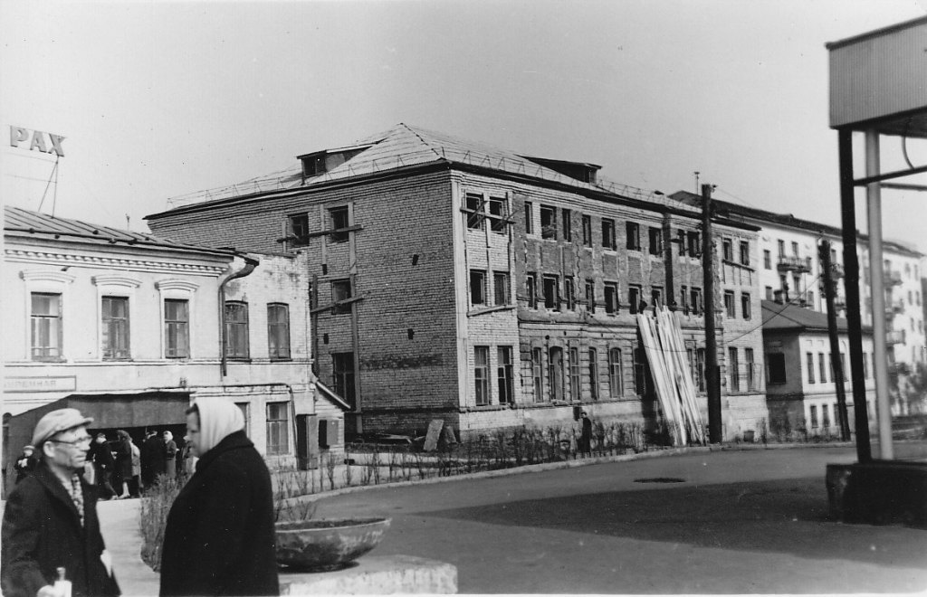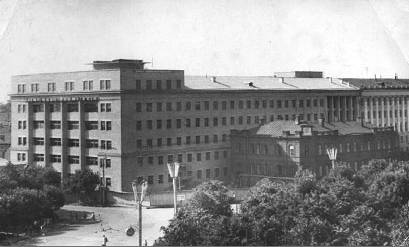 В 1963 г. начал свою работу реорганизованный Кировский заочный политехнический институт (КЗПИ), который в 1968 г. был преобразован в Кировский политехнический институт (КирПИ). Институт быстро рос и развивался, поэтому во второй половине 60-х гг. прошлого века для строительства учебного корпуса ему отвели всю южную границу Театральной площади – от улицы Карла Либкнехта до улицы Карла Маркса. На тот момент здесь находились два старых здания с большой историей. Одно из них – водолечебницу общины сестер милосердия Красного Креста (на фото оно еще стоит перед корпусом "Политеха) снесли, второе – дом купца Ласкина – разобрали. Началось строительство и к началу 1970-х гг. всю южную часть Театральной площади уже занимал огромный корпус «политеха». Однако память о здании, которое он «подмял» не пропала. В 1997 г. на здании института в том месте, где стоял дом общины Красного Креста была установлена мемориальная доска.