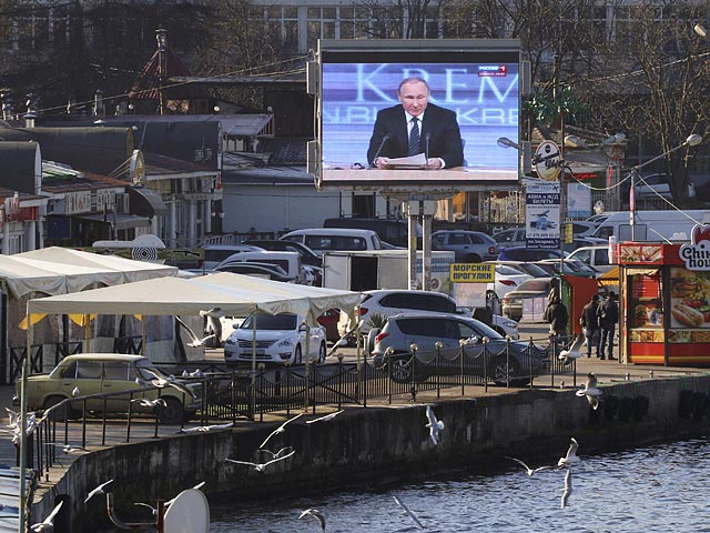 Жителям Крыма в условиях энергодефицита, из-за которого местные власти призывали население не включать телевизоры, предоставили возможность посмотреть 11-ю большую пресс-конференцию президента Владимира Путина в режиме онлайн на уличных экранах.