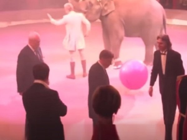 Цирковой слон едва не сбил с ног министра культуры России Владимира Мединского, губернатора Санкт-Петербурга Георгия Полтавченко и певца Иосифа Кобзона, участвовавших в номере на арене Цирка на Фонтанке.