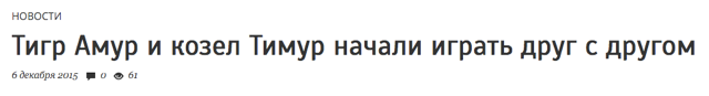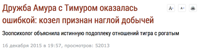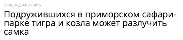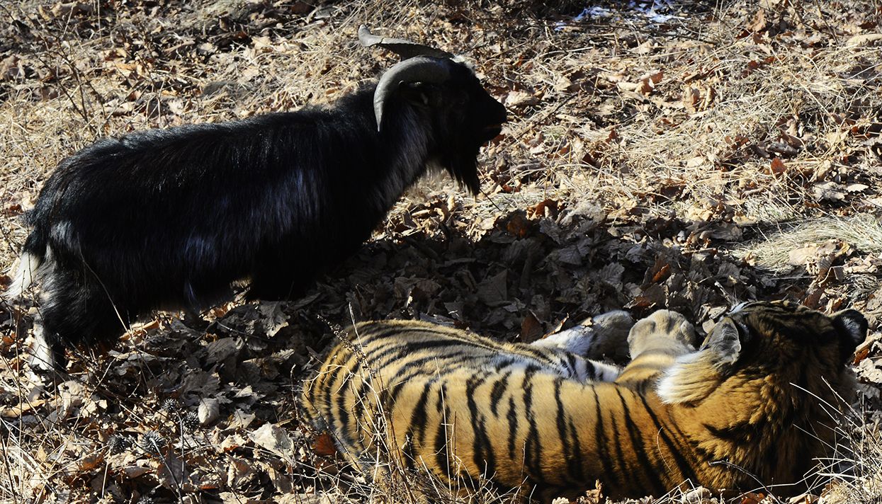 В конце ноября в Приморье тигр Амур подружился с козлом Тимуром, которого принесли ему на съедение. С тех пор хищник так и не съел своего друга: они продолжают общаться и гулять вместе, а СМИ — копаться в их отношениях.