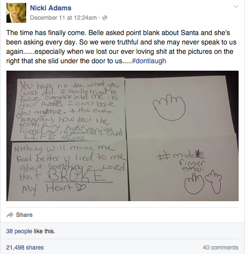 Жительница штата Мэриленд Ники Адамс опубликовала фотографию письма, которое ей написала 10-летняя дочь Белль. Девочка в нем возмущается тем, что родители рассказали ей, что Санты-Клауса не существует.