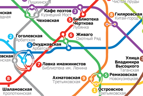 Так, на литературной схеме станция «Арбатская» будет называться «Окуджавской», «Таганская» станет «Солженицынской», «Третьяковская» — «Ахматовской», «Смоленская» — «Цветаевской», «Пушкинская» — «Платоновской», «Маяковская» — «Булкаговской». «Чеховская» и «Тургеневская» сохранят нынешние названия.