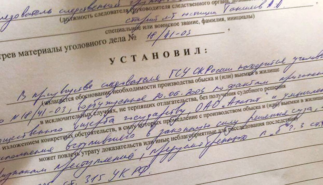 Официальная причина обысков — «материнское» дело ЮКОСа, возбужденное в 2003 году. Это подтвердил официальный представитель Следственного комитета Владимир Маркин. «Действительно, проводятся следственные действия по делу ЮКОСа, возбужденному еще в 2003 году», — заявил он. Позже на сайте СК появилась конкретика: обыски проводятся «в жилище и на местах работы индивидуальных предпринимателей и иных лиц, финансируемых из-за рубежа со счетов организаций, в прошлом, а, возможно, и в настоящем подконтрольных Михаилу Ходорковскому, Леониду Невзлину и другим участникам возглавляемой ими группы». По заявлению СК, это делается, чтобы установить законность приобретения акций ЮКОСа теми лицами, которые инициировали международное судебное разбирательство против России и выиграли в Гаагском суде 50 миллиардов долларов.