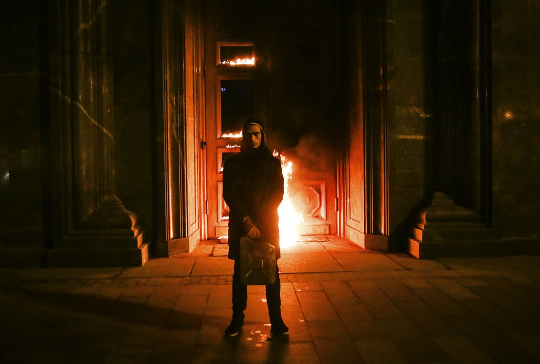 Художник-акционист Павел Павленский на фоне горящих дверей здания ФСБ на Лубянке. Павленский объяснил, что акция «Горящая дверь Лубянки» — протест «против непрерывного террора» спецслужб. Художник был задержан и находится под арестом.