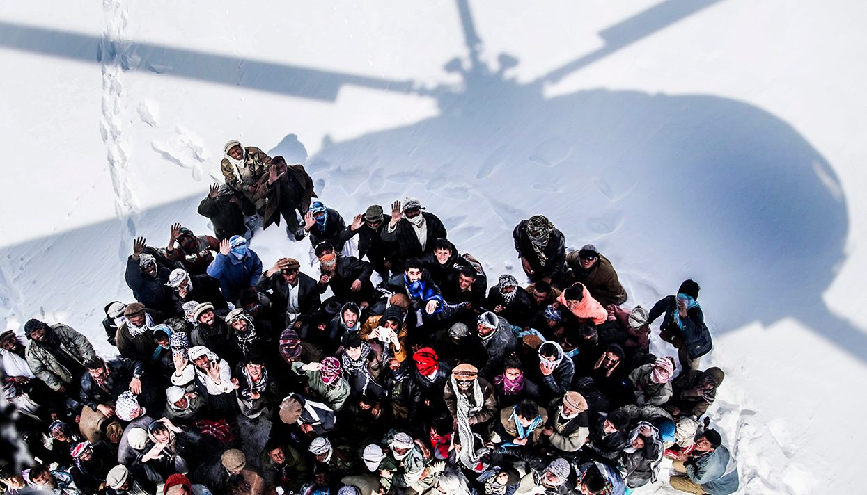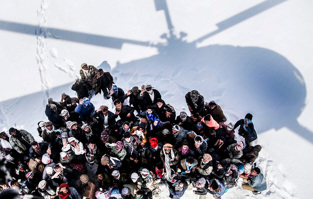 Люди, попавшие под сход лавины, ждут вертолета с продуктами в Панджшере, Афганистан. Жертвами лавины стали не менее 233 человек.