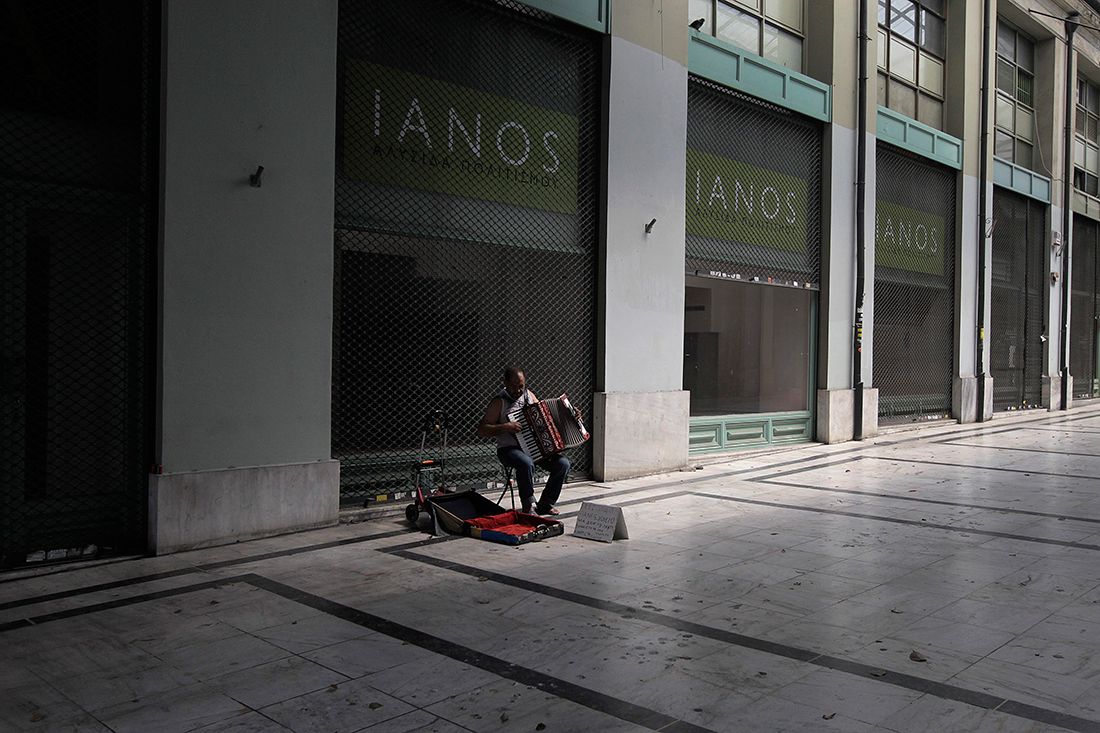 Уличный музыкант возле закрытых из-за кризиса магазинов в Афинах. Из-за экономических трудностей Греция оказалась на грани выхода из еврозоны.