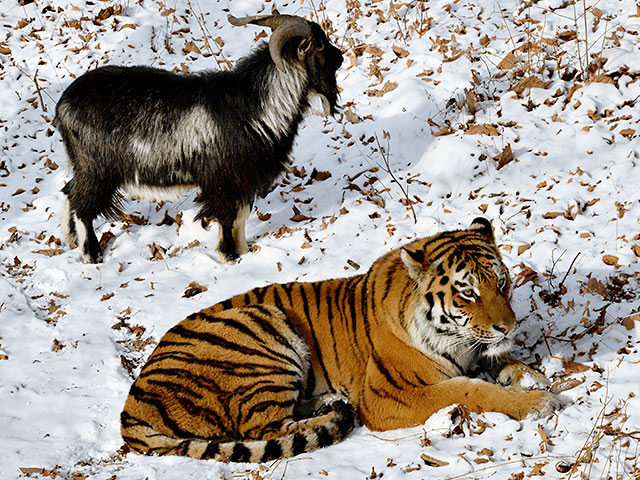 Напомним, история необычной дружбы Тимура и Амура началась более месяца назад. Обычно тигров в Приморском сафари-парке два раза в неделю кормят живой добычей, чтобы хищники не утратили навыки охоты. В конце ноября Амуру привели Тимура. Когда тигр попытался подступиться к жертве, козел дал ему отпор. Позже козла назвали Тимуром и поселили рядом с Амуром.