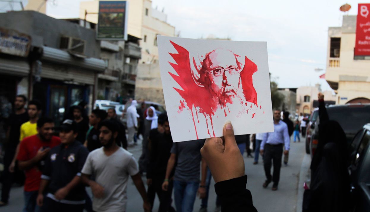 Демонстранты выкрикивают антиправительственные лозунги на марше в пригороде Манамы, столицы Бахрейна. 2 января 2016 года