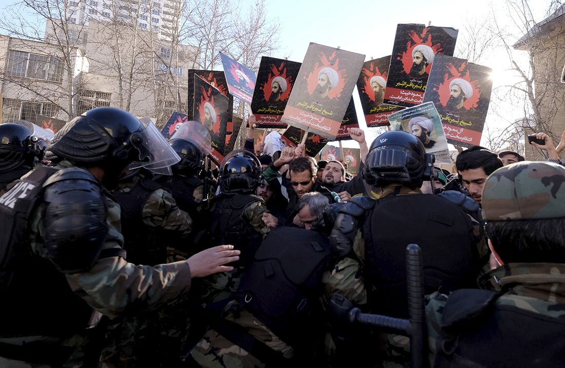 Полиция оттесняет толпу во время акции перед посольством Саудовской Аравии в Тегеране. 3 января 2016 года