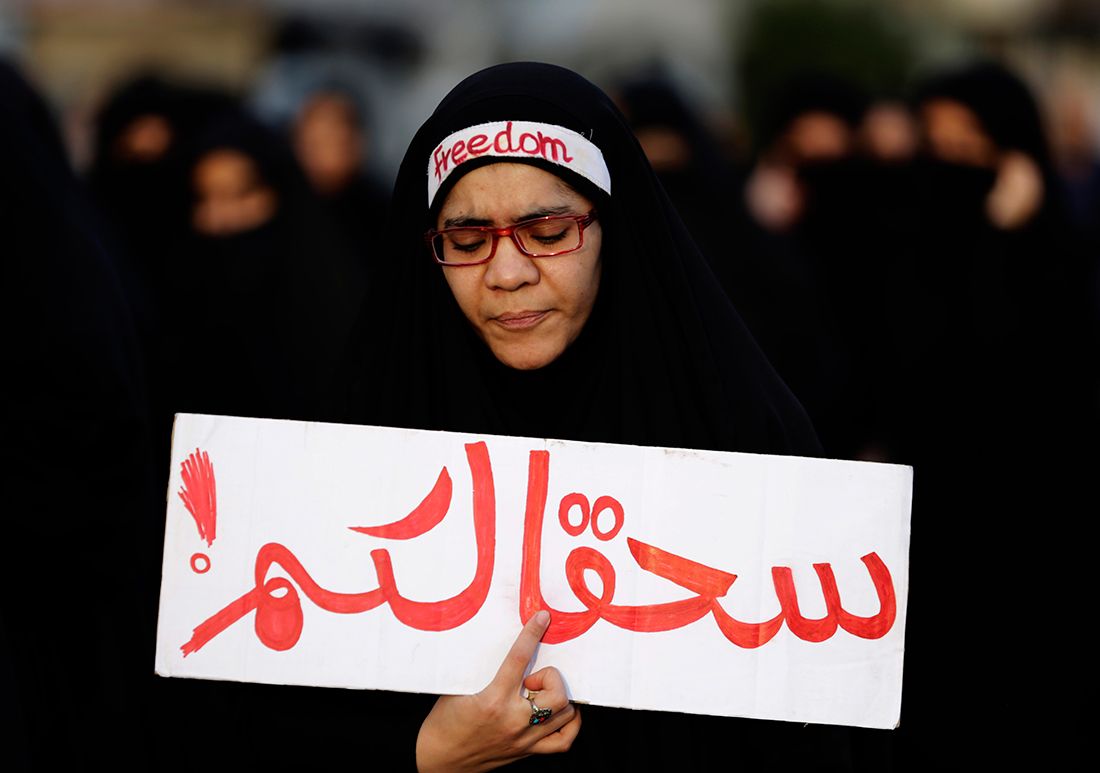 Участница антиправительственного марша в Бахрейне держит плакат с проклятиями. 2 января 2016 года