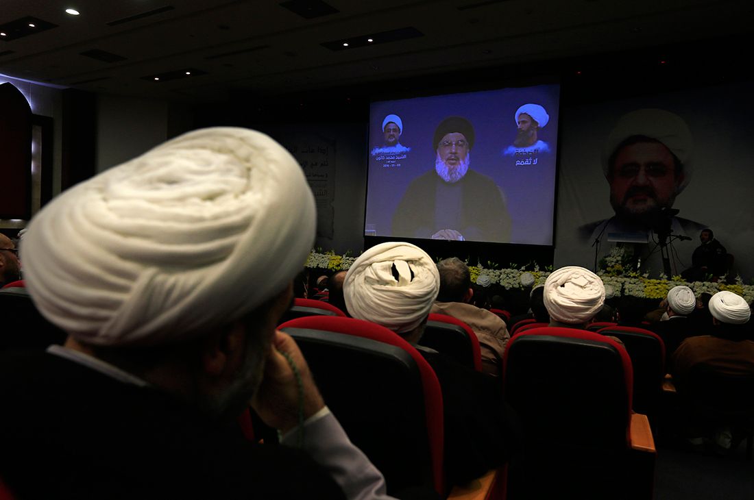 Ливанские шииты слушают обращение лидера радикального движения «Хизбалла» шейха Хасана Насраллы в пригороде Бейрута. 3 января 2016 года