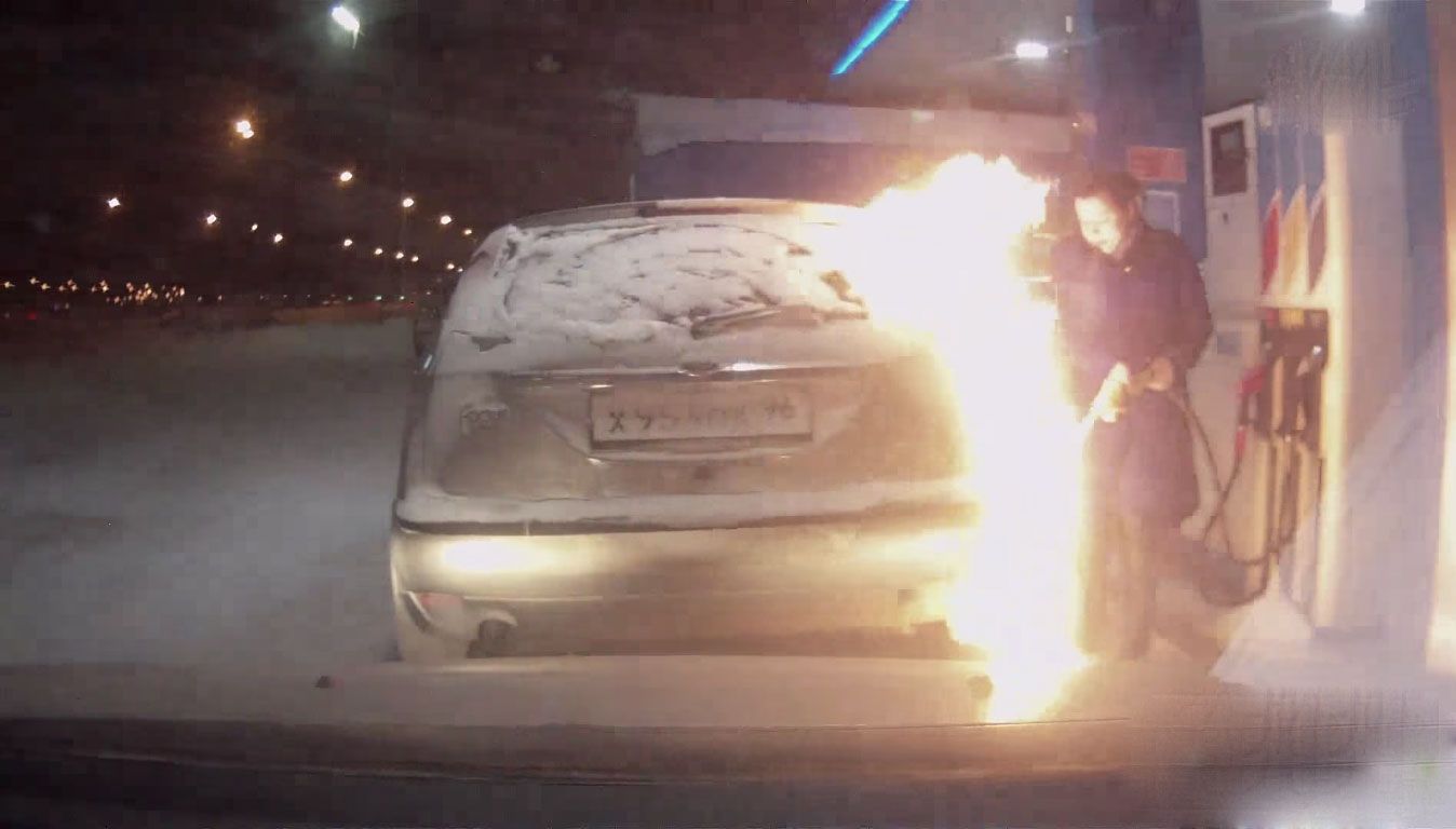 According to YouTube, the video was recorded in the city of Surgut, located roughly 1,800 miles northeast of Moscow. Using a cigarette lighter, the woman in the video apparently tried either to thaw a frozen trigger on the gas pump or to shine a light on her vehicle's gas tank. Whatever her reason, the experiment failed, setting fire to the gasoline and then the right side of her entire car.