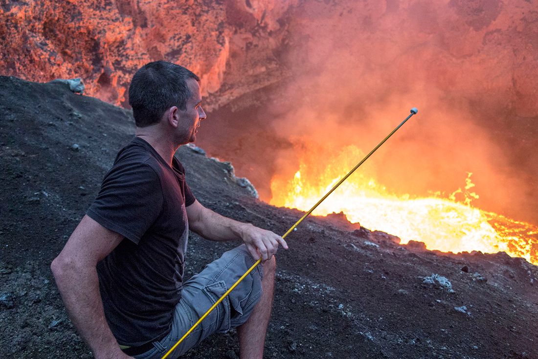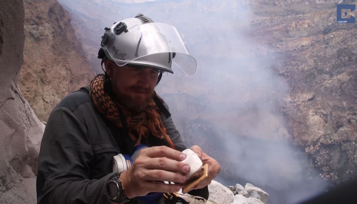Путешественник из Новой Зеландии Брэдли Эмброуз приготовил десерт смор над жерлом вулкана на острове Амбрим (Вануату). Чтобы сделать смор, Эмброуз зажал маршмэллоу и кусок шоколада между двумя крекерами, завернул получившийся бутерброд в фольгу и разместил его на краю одного из уступов.