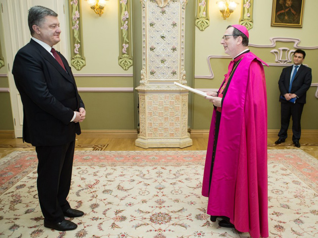 В ходе разговора с новым послом Ватикана на Украине Порошенко выразил благодарность за активное содействие Святого Престола в консолидации усилий международного сообщества, направленных на восстановление мира и стабильности на Украине. Он также поблагодарил за гуманитарную помощь, оказываемую в 2014-2015 годах для внутренне перемещенных лиц и пострадавших переселенцев.