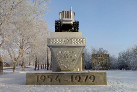 © Wiki.obr55.ru Памятник в поселке Русская Поляна, установленный к 25-летию освоения целинных и залежных земель До конца 2016 года, объявленного Годом отечественного кино, в рамках программы Министерства культуры будет создано 143 кинотеатра в малых и средних городах 51 региона РФ.