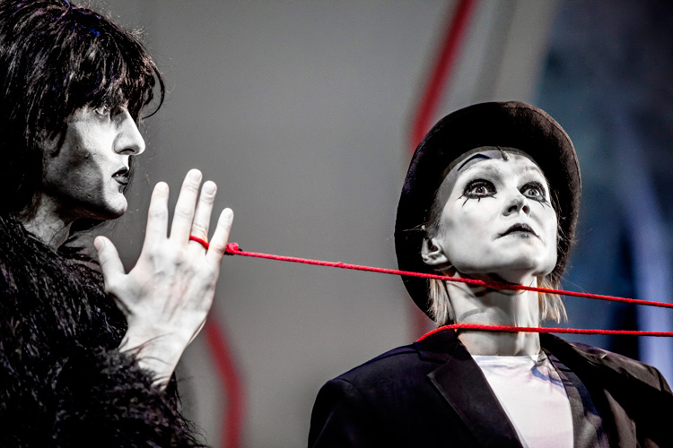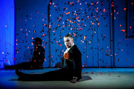 Об игровой природе спектакля можно судить уже по тому, кто его исполняет. Артистов на сцене всего четверо, среди них — опытнейшая актриса-звезда и три молодых актера: поди сыграй «Идиота» в таком составе. Нужно, впрочем, уточнить, что приме достается главная мужская роль, а ее юным коллегам — как женские, так, собственно, и мужские. В антураже пантомимы Мышкин Ингеборги Дапкунайте выглядит более сложной модификацией ранимого и застенчивого Пьеро. За Арлекина у Диденко, как можно догадаться, Рогожин, в образе которого попеременно выступают Евгений Ткачук и Александр Якин, маску Коломбины делят трагифарсовые женские персонажи — Настасья Филипповна (Роман Шаляпин) и Аглая (Павел Чинарев / Артем Тульчинский), они же перевоплощаются в эпизодических персонажей — Ипполита, Ганю, Евгения Павловича.