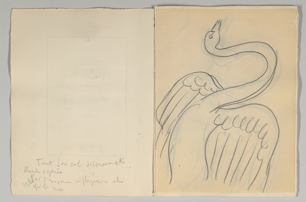 Более того, экспозиция впускает зрителя в творческую мастерскую Матисса. На примере лебедя, украшающего книгу Малларме, мы видим, что законченному рисунку предшествовала утомительная, по-ученически усердная работа. Сперва лебедь рисовался по всем академическим правилам, со штриховкой, растушевкой и многочисленными поправками. Один мертвый эскиз сменял другой, пока глаз автора не находил в хаосе линий нужные ему формы. Тогда Матисс обводил углем лебединый абрис и переносил его в книгу. Результат кажется плодом спонтанной игры, но не является им. Следить за черновой работой гения представляется кощунством – как смотреть на исчирканные поправками рукописи Моцарта или Пушкина. Но тем не менее, именно так – из ремесленного труда – рождалась то парящая, то танцующая линия Матисса, оживляющая все, чего касалась его рука.