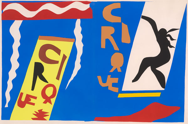 Именно такая книга венчает выставку Матисса. Это – знаменитый фолиант 1947 года “Джаз”. Стареющий художник в эти годы обратился к аппликациям, научившись, по его словам, “рисовать ножницами”. “Джаз” (первоначально он хотел назвать эту книгу “Цирк”) составляют свободные цветные фантазии. Самая знаменитая из них, та, что попала на плакат выставки, изображает черную фигуру с красным сердцем. Вокруг человечка – бескомпромиссно синее небо с беззастенчиво золотыми звездами. Расставив руки, склонив голову, прихрамывающей, по-джазовому синкопированной походкой он идет к нам навстречу, чтобы поделиться радостью.