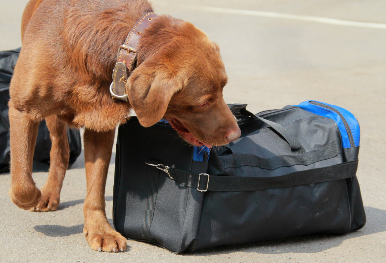 Служебная собака во время занятий по обнаружению наркотических веществ.