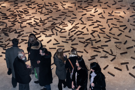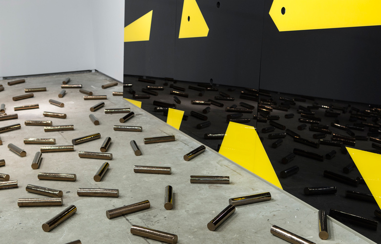 © POP/OFF/ART Ольга Татаринцева. Ограничение звука I. 2014 Однако в инсталляции «Вместо музыки» «желтый звук» не только ограничивается черной переполосицей, но и буквально расстреливается — работа изрешечена пулевыми отверстиями. Гильзы от патронов сплошняком покрывают пол галереи. И в этом ковре из пуль можно усмотреть еще одну отсылку — к «Семенам подсолнечника» Ай Вэйвэя и «Без названия (Плацебо)» Феликса Гонзалес-Торреса. Этот диалог — вполне конкретный месседж, в своем роде самоидентификация и знак солидарности. Феликс Гонзалес-Торрес, кроме всего прочего, был гомосексуалом и умер от СПИДа. В известной степени он был «исключенным». Упомянутая же работа весьма провокативна. Обернутые в серебряную фольгу леденцы застилают пол правильным прямоугольником, их общий вес равен весу тела умершего от «чумы ХХ века» возлюбленного художника. Зрителям предлагается угощаться конфетами и тем самым вкушать «тело погибшего».