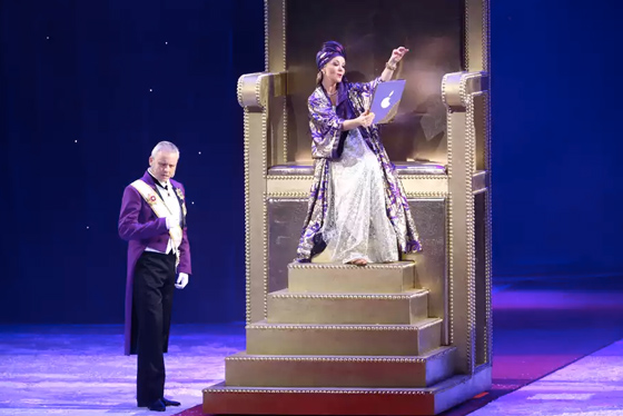 © Мариинский театр Месяц Май поет про санкции. Мачеха с дочкой Злыдней, мечтая о быстрых деньгах, придумывают, на что их потратить: на виллу в Каннах, частный самолет и престижный футбольный клуб. Капризная матушка-царица скандирует «в целях демократизации» указ о немедленной доставке во дворец свежих фиалок. Придворные сетуют на окружающую их беспрерывную блажь, но соглашаются: «лучше помолчим». Бравые царские гвардейцы анекдотично маршируют: «Мы за тебя, Мать, дом забудем, жизнь положим, за тебя мы пойдем на смерть, ать-два, ать-два… строже шаг…» — срываясь в конце концов на «соловья-пташечку».