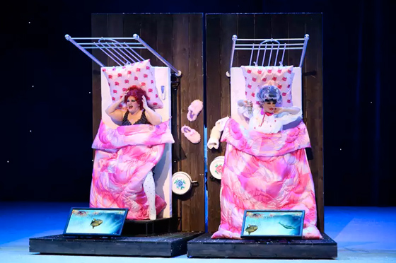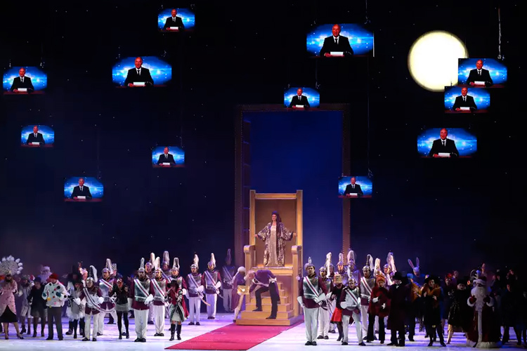 Для авторов спектакля — режиссера Алексея Степанюка и сценографа Александра Орлова — это уже третья постановка оперного Щедрина после «Очарованного странника» и «Левши» (а всего в Мариинке теперь идут четыре оперы композитора и три его балета). Помимо циркового трюка с месяцами на колесиках и прилагающегося к ним изобретательного дефиле от художницы по костюмам Ирины Чередниковой спектакль украшают кувыркающиеся комья снега, поставленные на попа и как бы показанные сверху кровати лежебок-консумисток Мачехи и Злыдни и бесчисленные плазменные экраны с головой диктора, зачитывающего очередной бессмысленный указ.