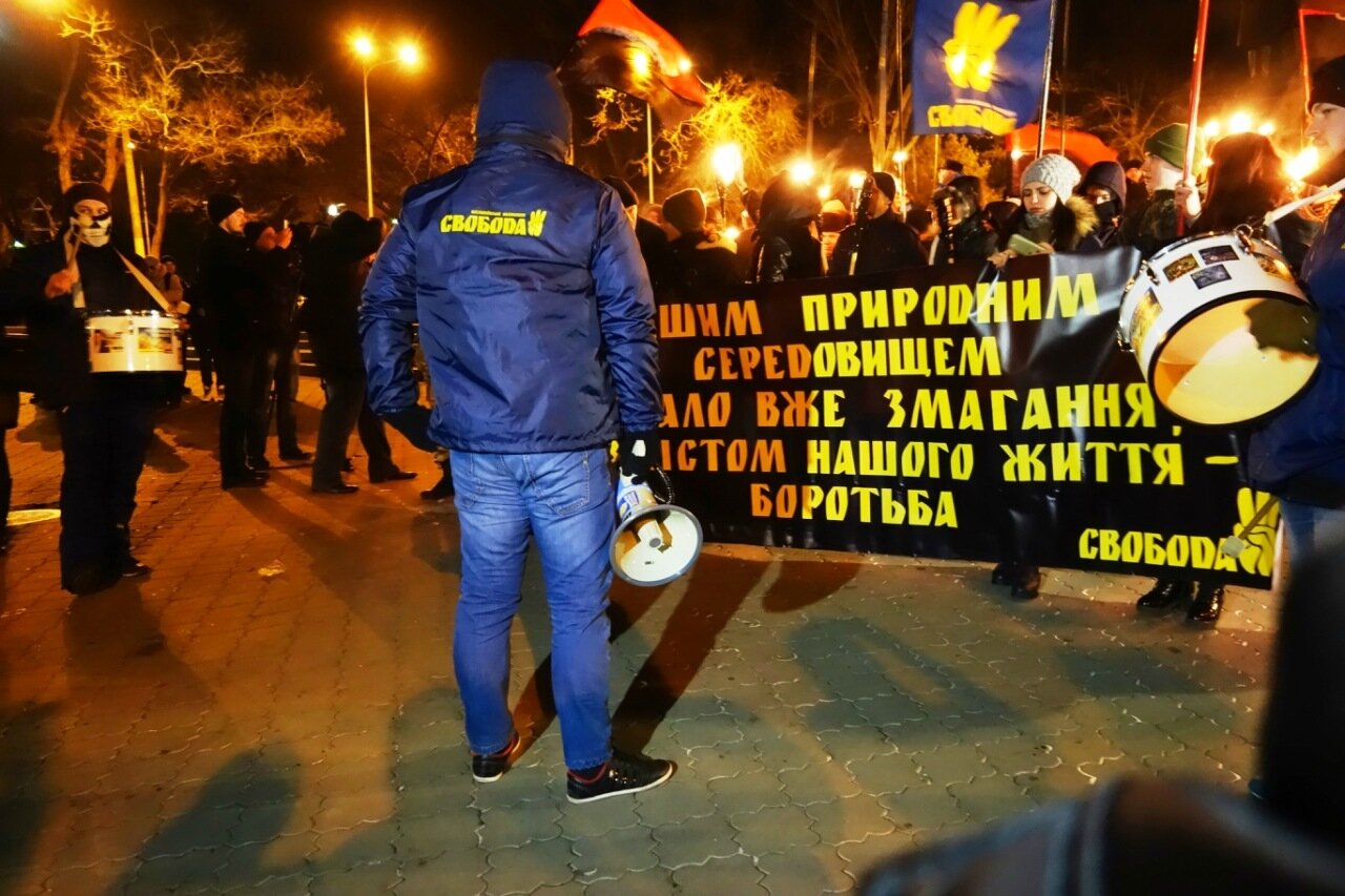 При выходе на Приморский бульвар факелы стали гаснуть, и их активно запихивали в урны. У памятника дюку Ришелье патриотов было в районе сотни. Местные руководители патриотических организаций выступали с грозными речами, адресатами которых были то путинская Россия, то продажные киевские политики.