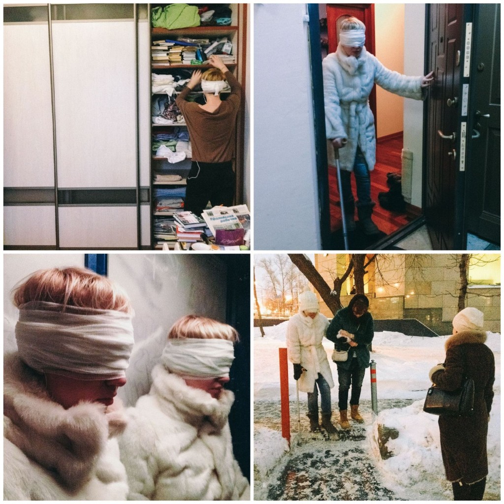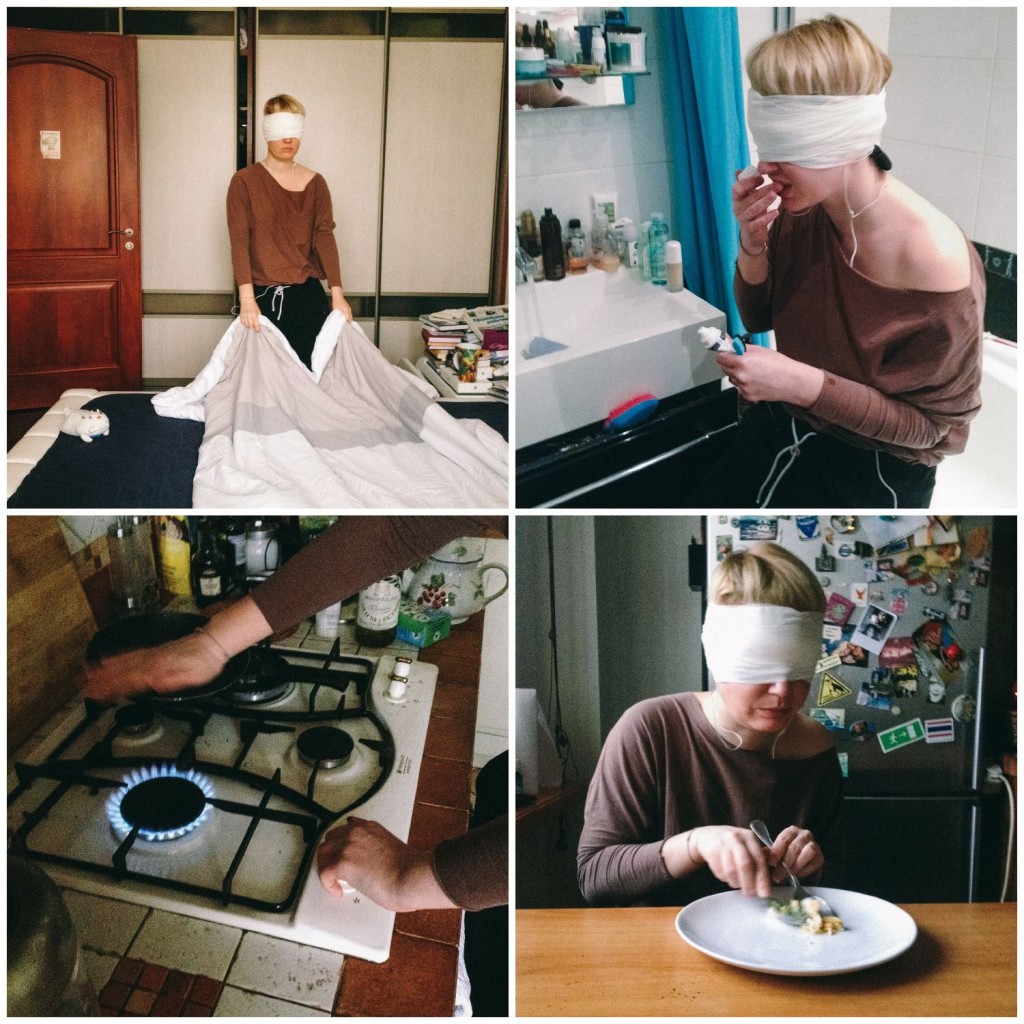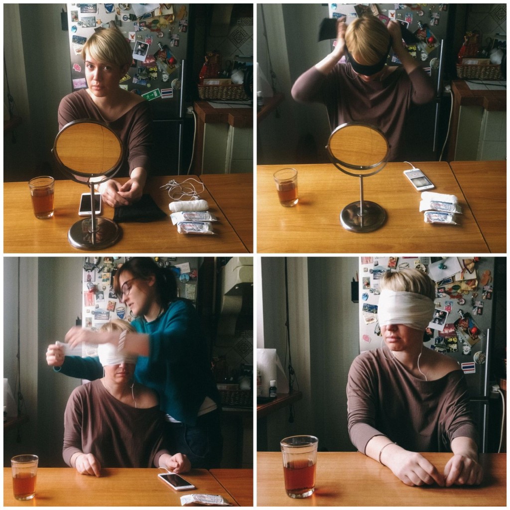 Лена за минуту до начала эксперимента;Лена завязывает глаза сначала черной тканью, потом бинтом;