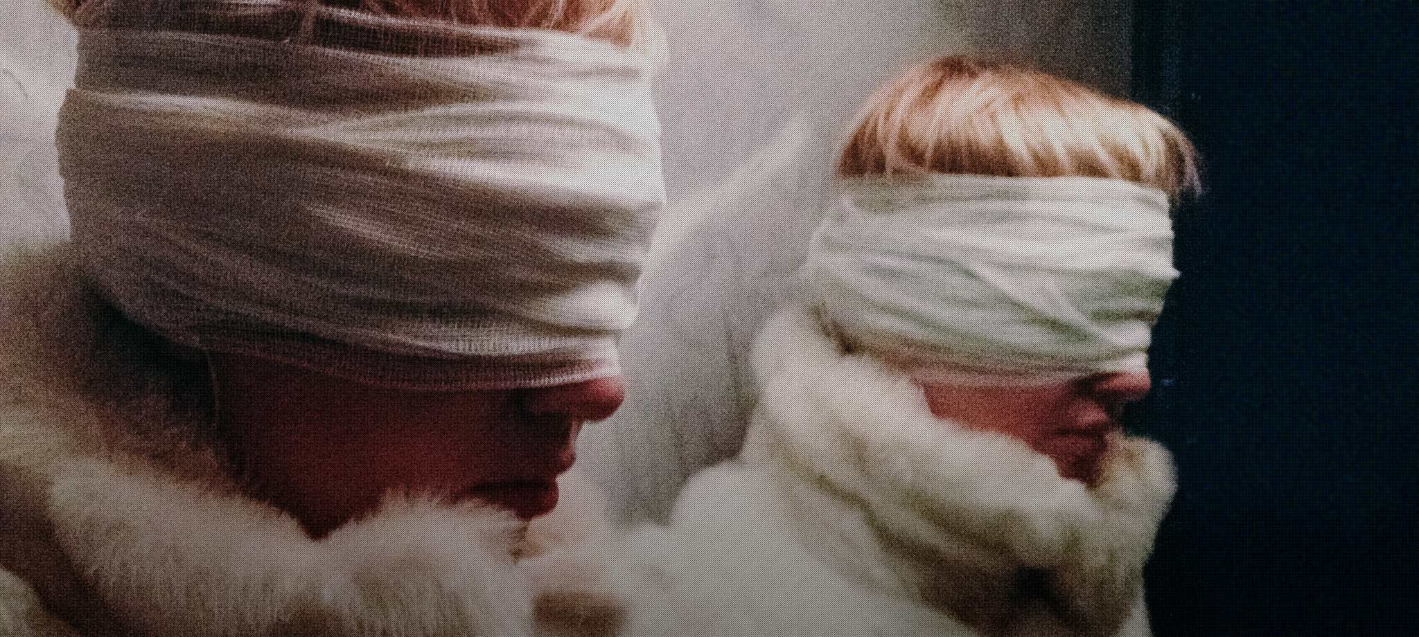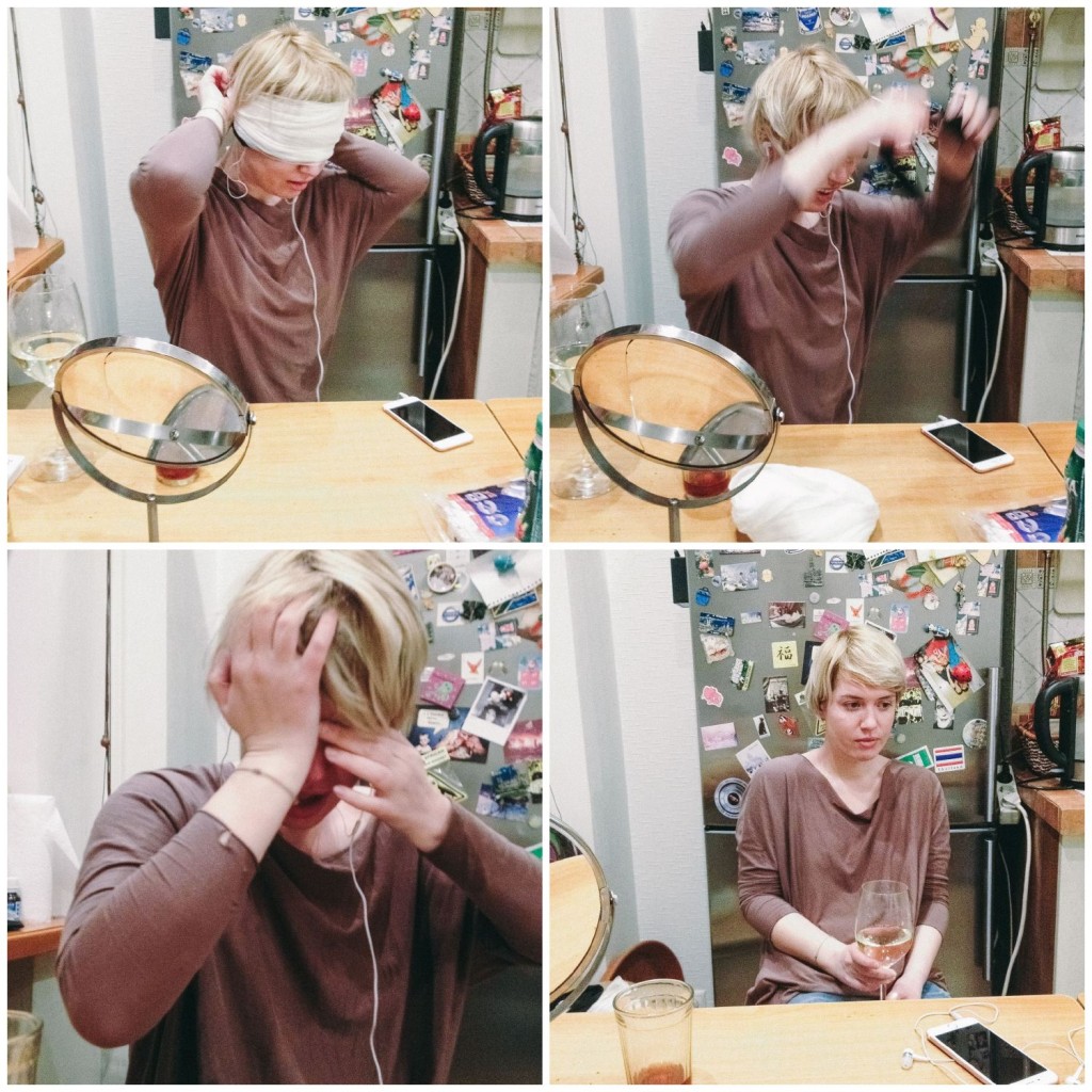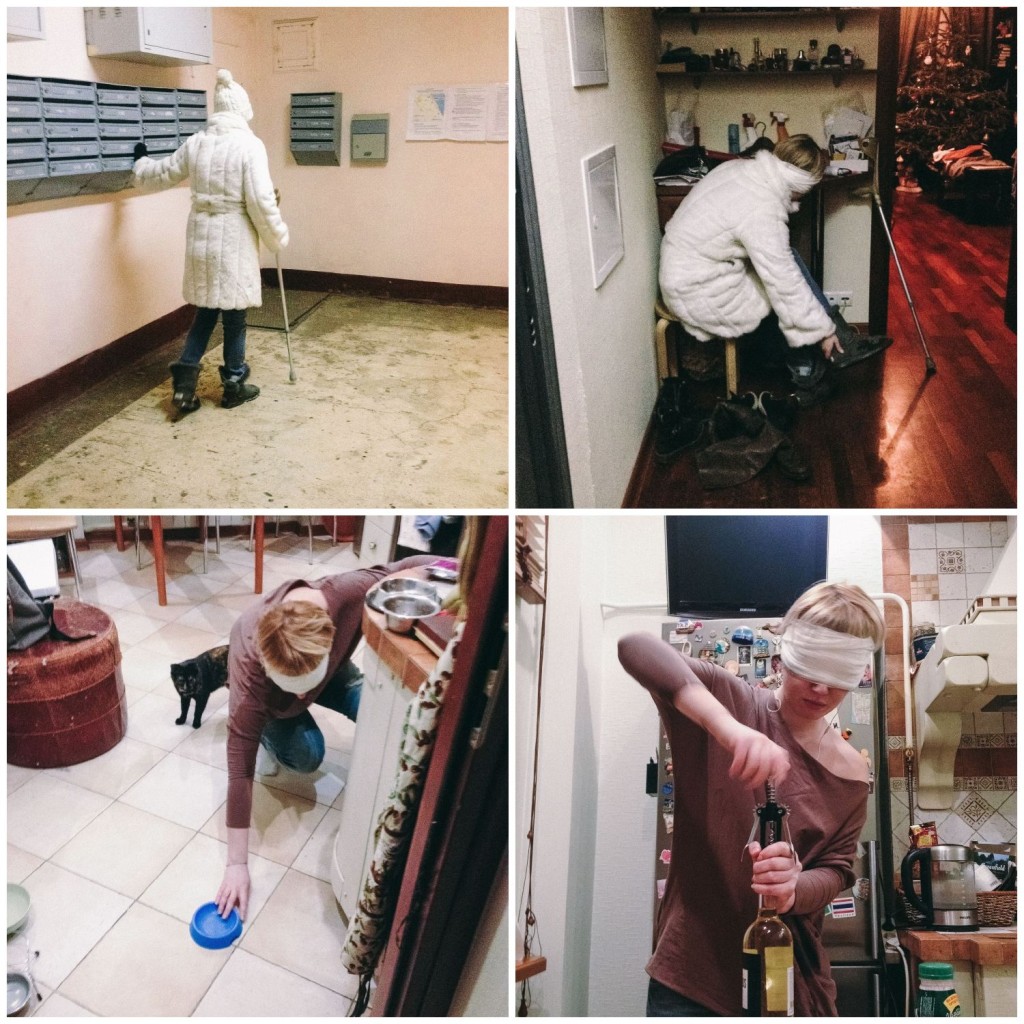 Лена за минуту до начала эксперимента;Лена завязывает глаза сначала черной тканью, потом бинтом;