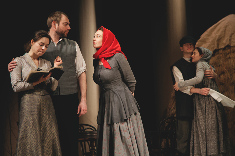 Найдя верный тон, то приближающий героев к нам, сегодняшним, то ироничный и препятствующий возможному зрительскому амикошонству («Что, думаете, они такие же, как мы? — будто бы говорят публике режиссер с драматургом. — Не тут-то было!»), сочинители спектакля двигаются внутри каждого эпизода разнообразно и не без озорства. Между собой главки «Русского романа» склеены музыкой постоянного соавтора Карбаускиса, композитора Гиедрюса Пускунигиса, — и остинатным присутствием Софьи Андреевны, сыгранной Симоновой женщиной неординарной и по-настоящему живой, во всей сложности своего характера. Там, где в пьесе — искусство литературной репризы, мастерски сцепленных времен и переклички голосов вполне в духе Стоппарда, в спектакле Карбаускиса — живая плоть интонации, жеста, баловства и, конечно, патетики. Текст и артистическая энергия здесь сошлись как надо: две роли Татьяны Орловой, замечательно сыгравшей яснополянскую крестьянку Аксинью и ловкого хлыща Черткова, реактивная Кити Веры Панфиловой, Сергей Удовик в трех ипостасях — все это не что иное, как чистая театральная радость, которую Карбаускис всегда умел добывать в непростых трениях с самым разнообразным литературным (и не только) материалом.