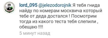На этот коммент отреагировал пользователь с ником @lord_095: «@jelezodorojnik Я тебя гнида найду по номерам москвича который тебе от деда достался! Посмотрим тогда из какого теста тебя слепили, обещаю!»
