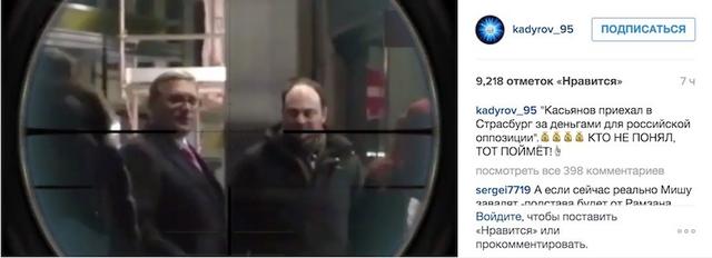 Дальше — больше. Кадыров опубликовалв своем Instagram видео с лидером ПАРНАС Михаилом Касьяновым и заместителем председателя партии Владимиром Кара-Мурзой младшим. Сам видеосюжет — Касьянов приехал в Страсбург за деньгами для российской оппозиции»вышел на телеканале Lifenews 26 января — днем ранее Михаил Касьянов с соратниками выступили на конференции в рамках сессии Парламентской ассамблеи Совета Европы, где призвали взять под контроль расследование убийства Бориса Немцова.